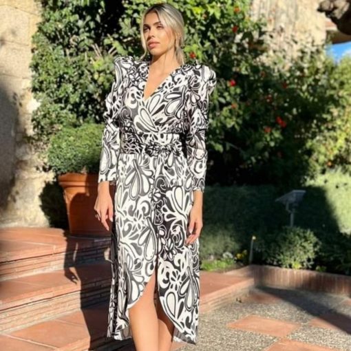 Vestido estampado, de escote de pico cruzado, con mangas largas y hombros abullonados, incluye lazaDA, parte baja, suelta, con volante y abertura central. Se hace desde la talla 38 hasta la 50.