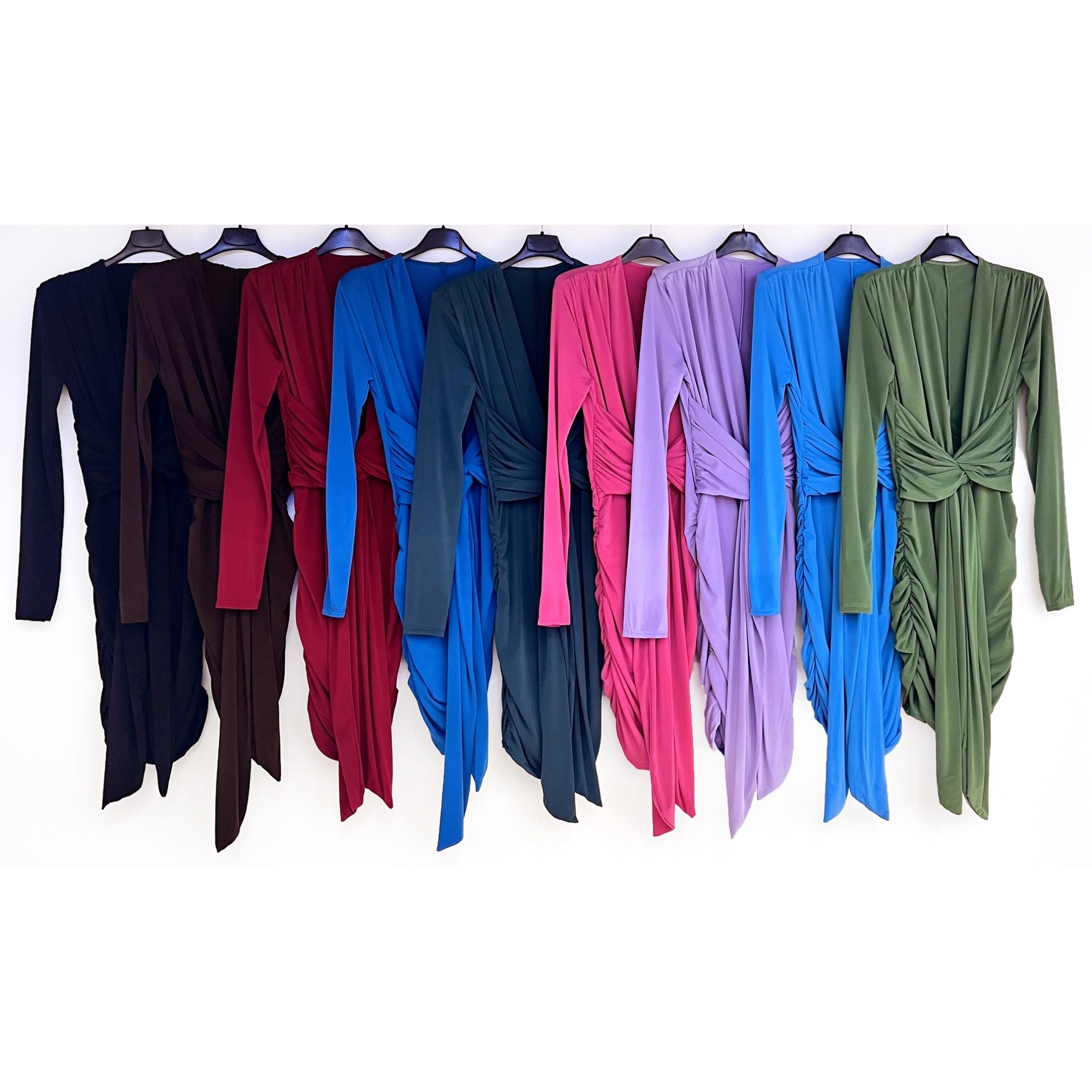 Vestido corto, de mangas largas, con escote de pico, tejido finito de licra, ajustado, con frunce, y nudo en el pecho, Se hace en muchos colores, talla única, ( desde la 34 hasta la 42, aproximadamente).