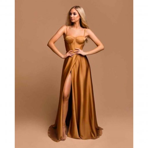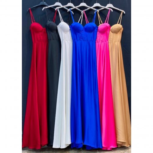 Vestido largo de satén, tipo corset, con escote de corazón y espalda con cuerdas ajustables, lleva copas interiores, cremallera y tirantes regulables de quita y pon, tipo sujetador.
