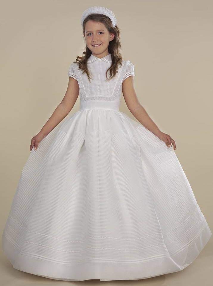 Vestido de comunión con cuello de solapa redondo, tipo bebé,de mangas cortas con adorno en el pecho, estampado de lineas en el bajo de la falda. Disponible desde la talla 110 hasta la 140.