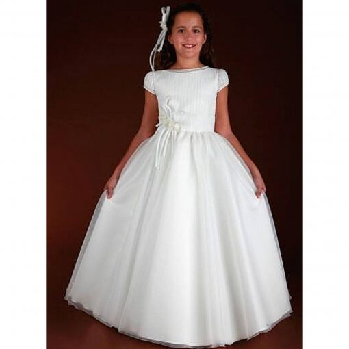 Vestido de comunión de cuello barco, con mangas cortas y adorno floral blanco en la cintura. Disponible para medidas de 130 cm.