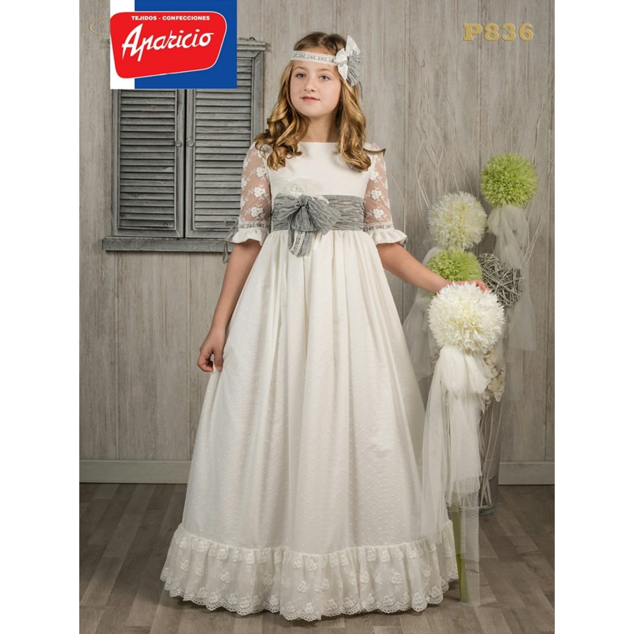 Vestido de comunión, con cuello barco, mangas francesas con tul bordado, y fajín gris con lazo en la cintura. Disponible para medidas de 130 cm.