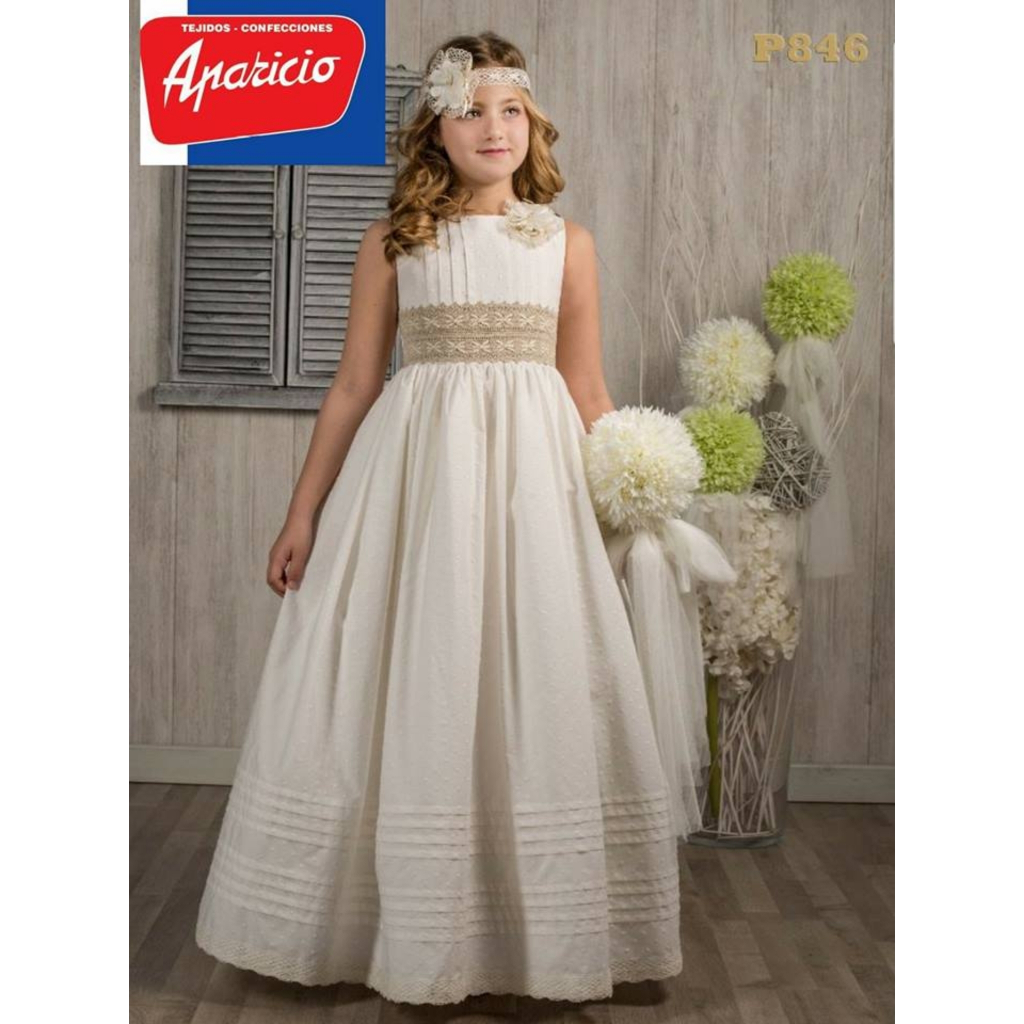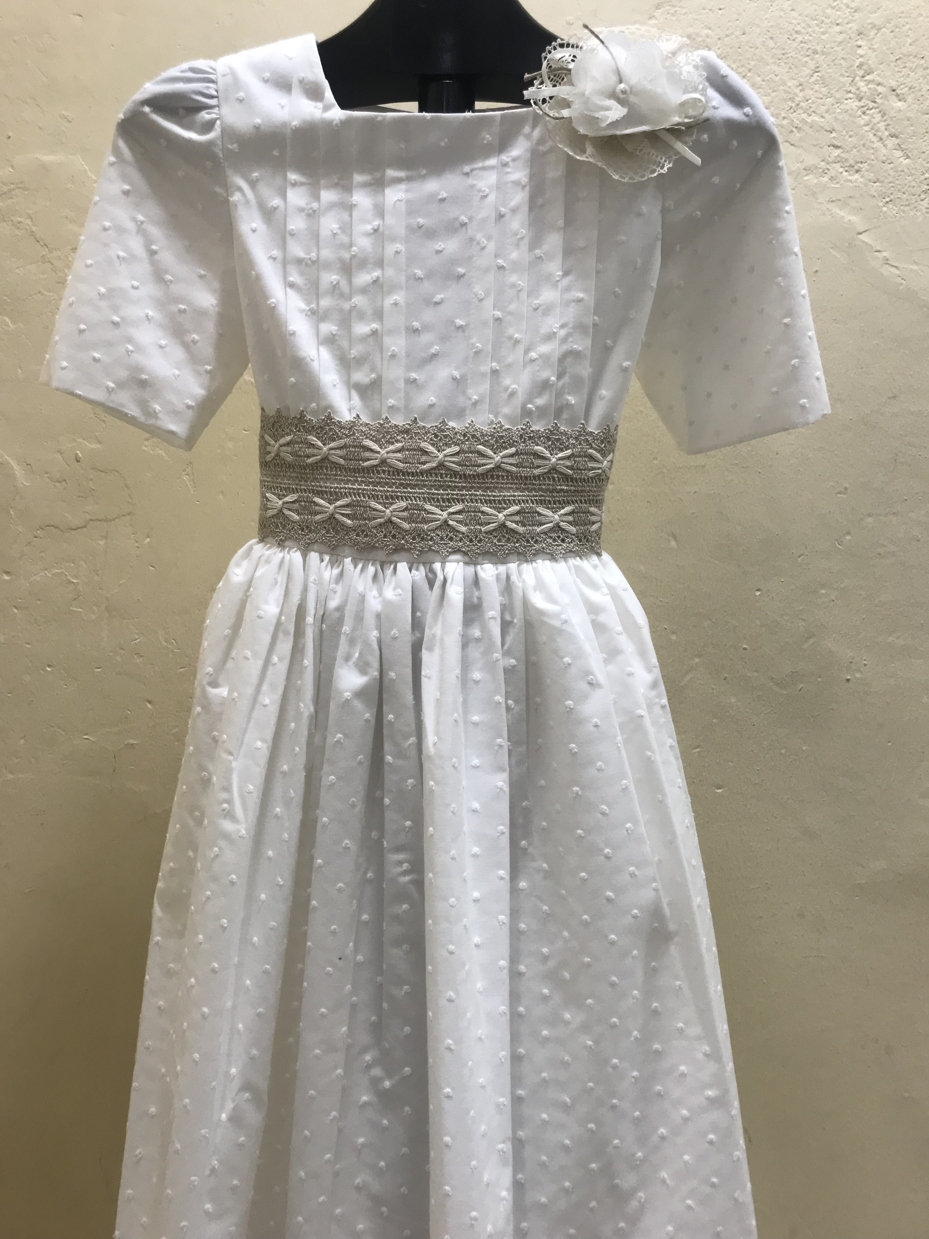 Vestido de Comunión de mangas cortas, cuello a la caja, pliegues con detalles en el pecho y bordado tostado en la cintura. Agotado sin mangas, Solo disponible en mangas cortas, medidas de 115, 120 y 130 cm.