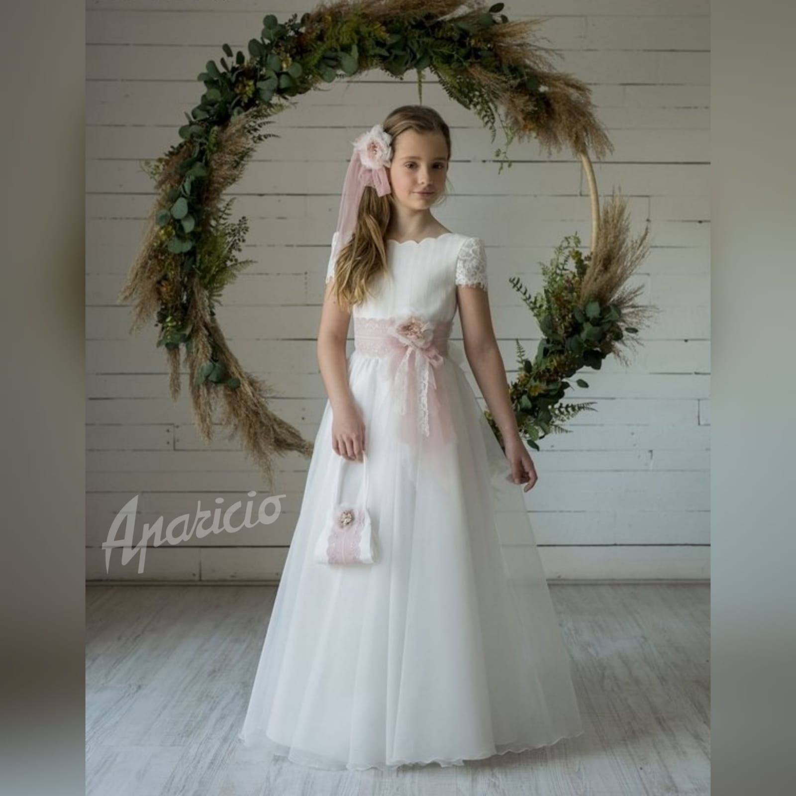 Vestido de niña de comunión con cuello barco, mangas cortas bordadas, y cinturón rosa con adorno floral. Disponible para medidas de 125 cm, 130 cm, 135 cm y 140 cm.