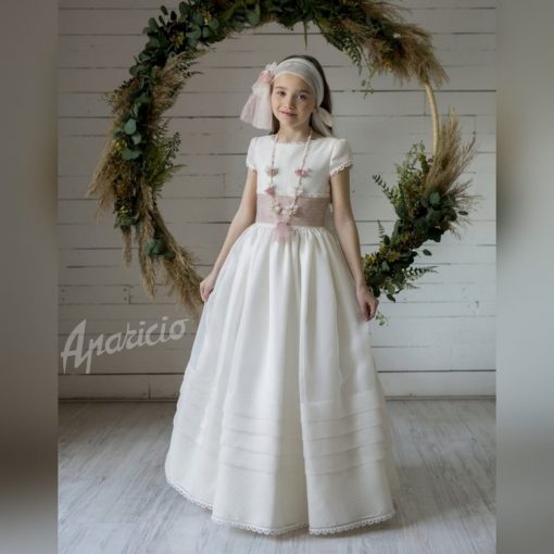 Vestido de niña de comunión, de mangas cortas, cuello a la caja, y fajín rosa bordado en la cintura. Disponible para medidas de 120 cm, y 130 cm.