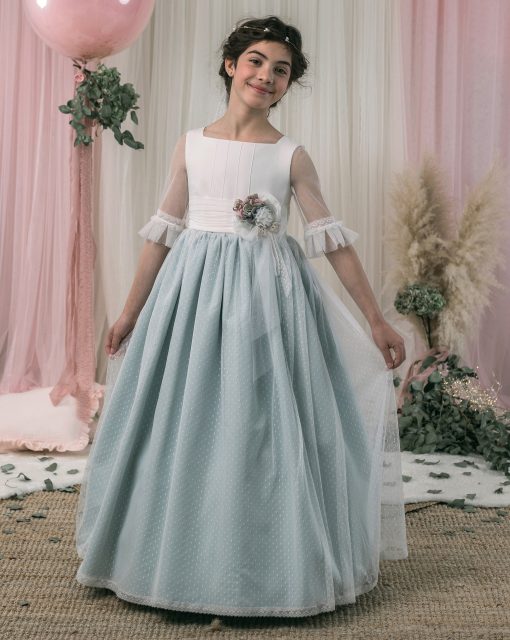 Vestido de comunión bicolor, con cuello barco, mangas al codo con volantes, y adorno floral en la cintura y falda azulona. Medidas hasta 125cm.