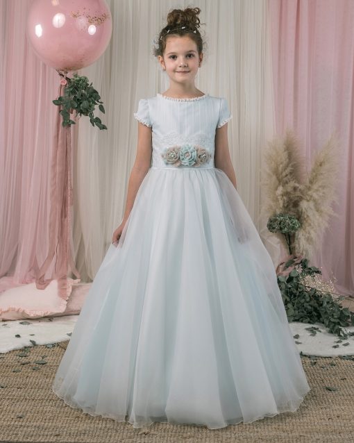 Vestido de comunión de mangas cortas, de color celeste, con adorno floral en la cintura. Medidas 120 cm.