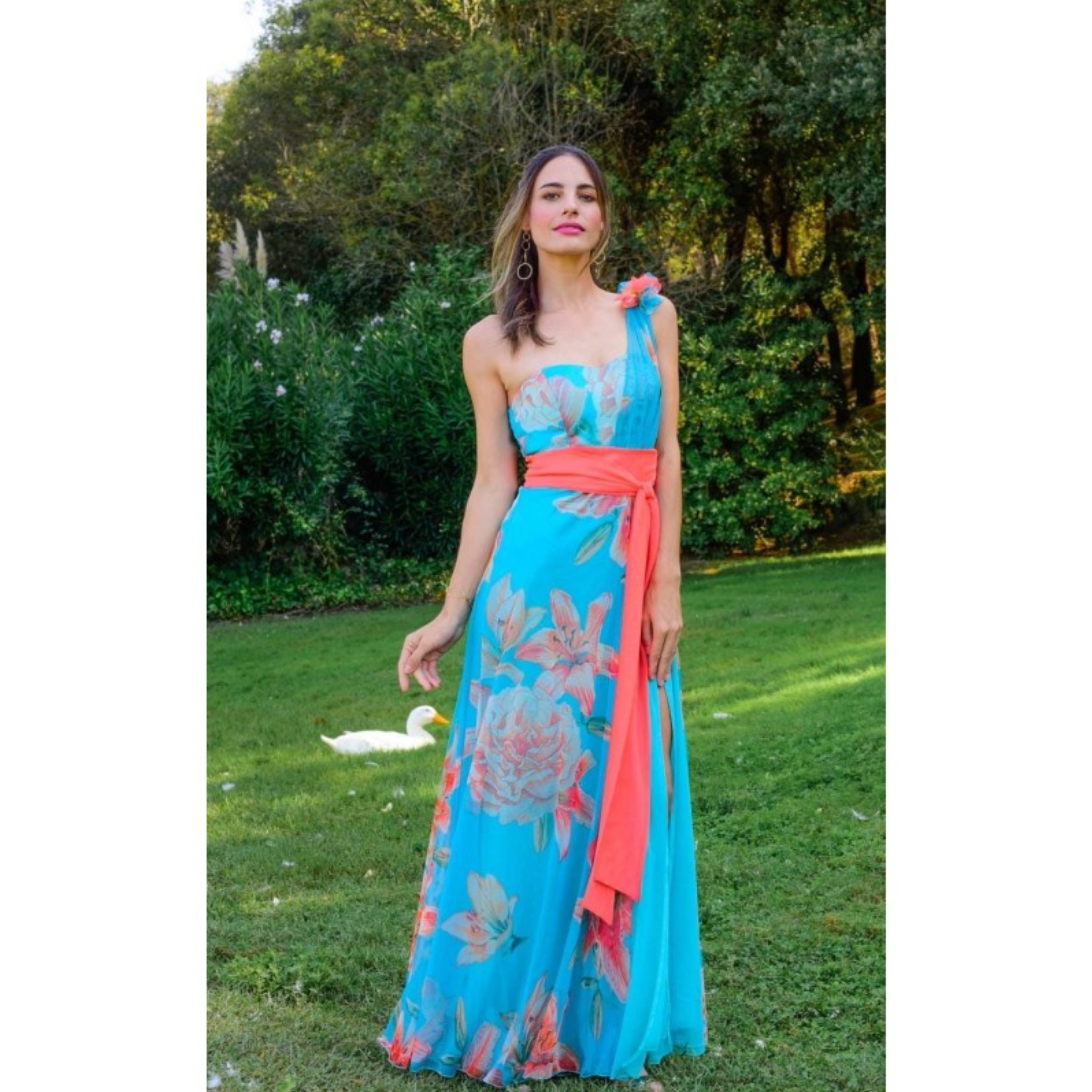 Vestido largo, estampado, en tejido de tul, con escote asimétrico, adorno de quita y pon, en el hombro. Se hace desde la talla 38 hasta la 52.