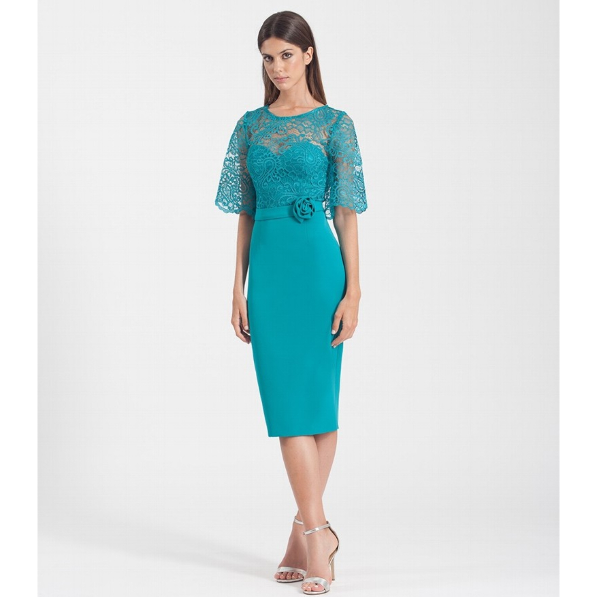Vestido de mangas cortas y cuello redondo, de encaje bordado y forro interior de escote de pico y tirantes, parte de abajo lisa. Incluye cinturón. Cierre trasero de cremallera y un botón.