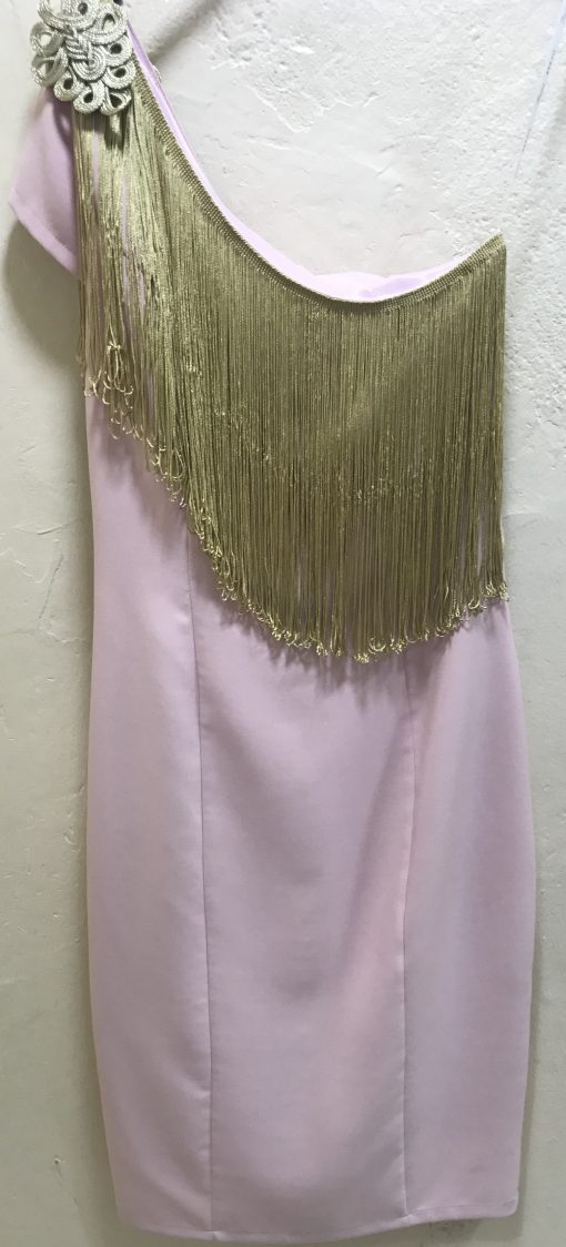 Vestido con cuello asimétrico, con una manga corta, y adornos de flecos dorados en pecho y espalda. Cierre trasero con cremallera invisible y abertura trasera en el bajo. Disponible desde la talla S hasta la L, en celeste liso, rosa liso y estampado de flores en agua viva.