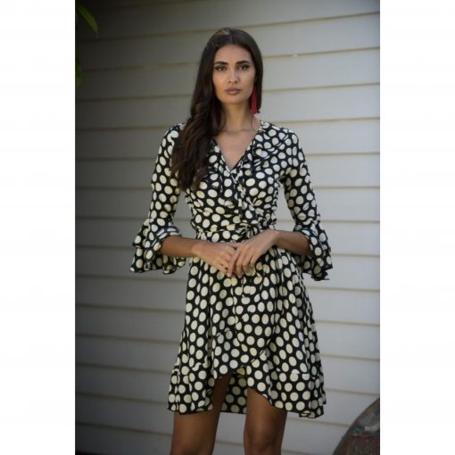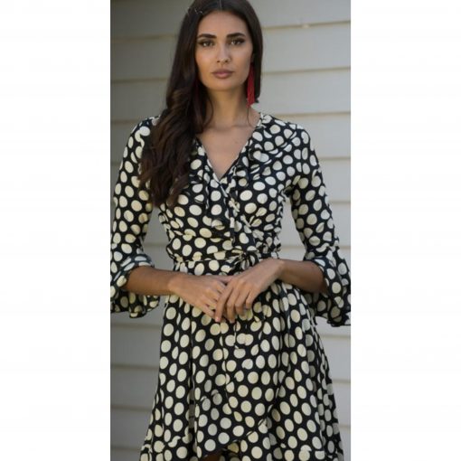 Vestido estampado de lunares, de mangas 3/4, con volantes, escote de pico cruzado, con lazada cruzada en la cintura. Disponible últimas unidades, talla S y L.