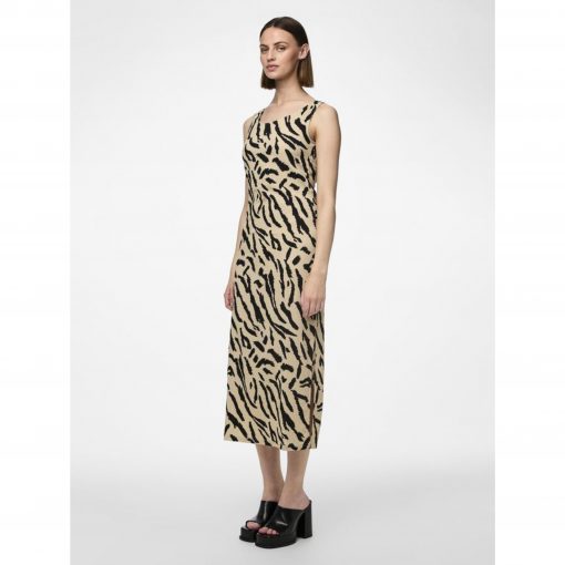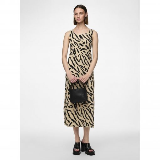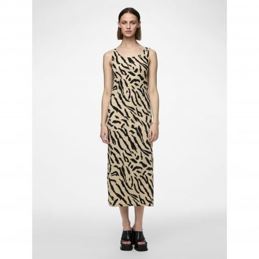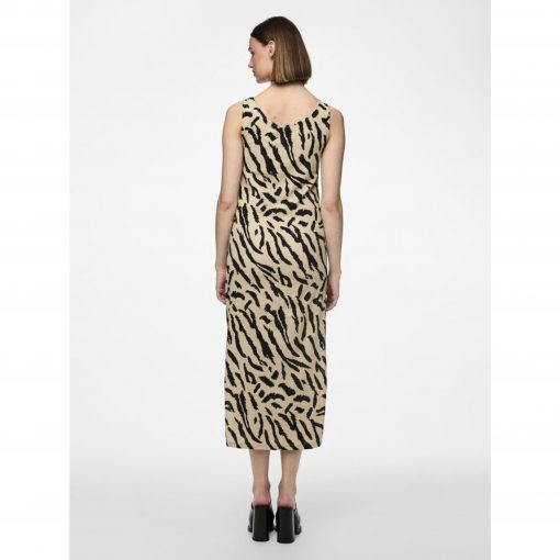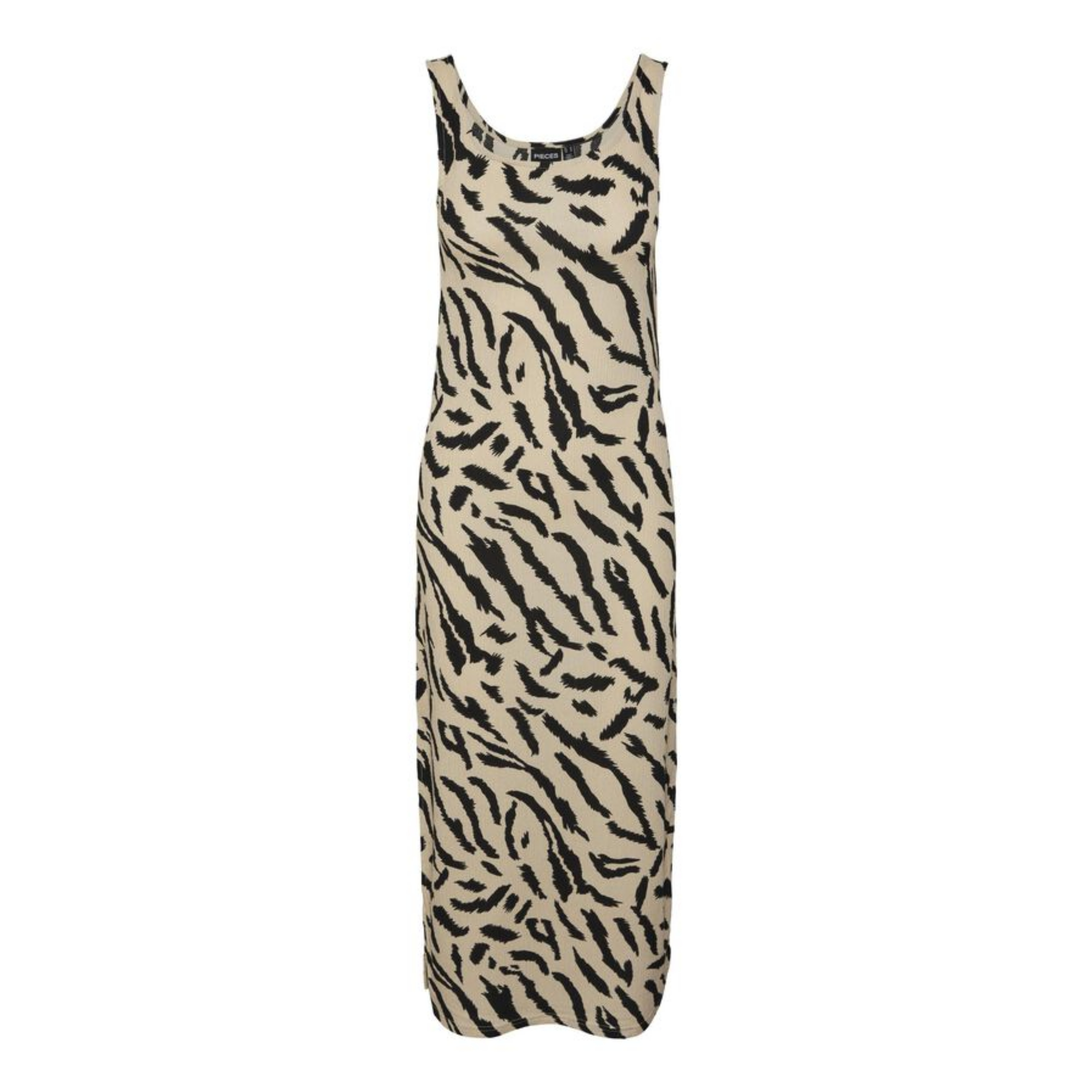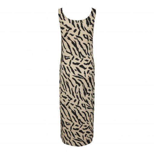 Vestido estampado animal print, de largo midi, son mangas, con cuello redondo. De tejido de punto.