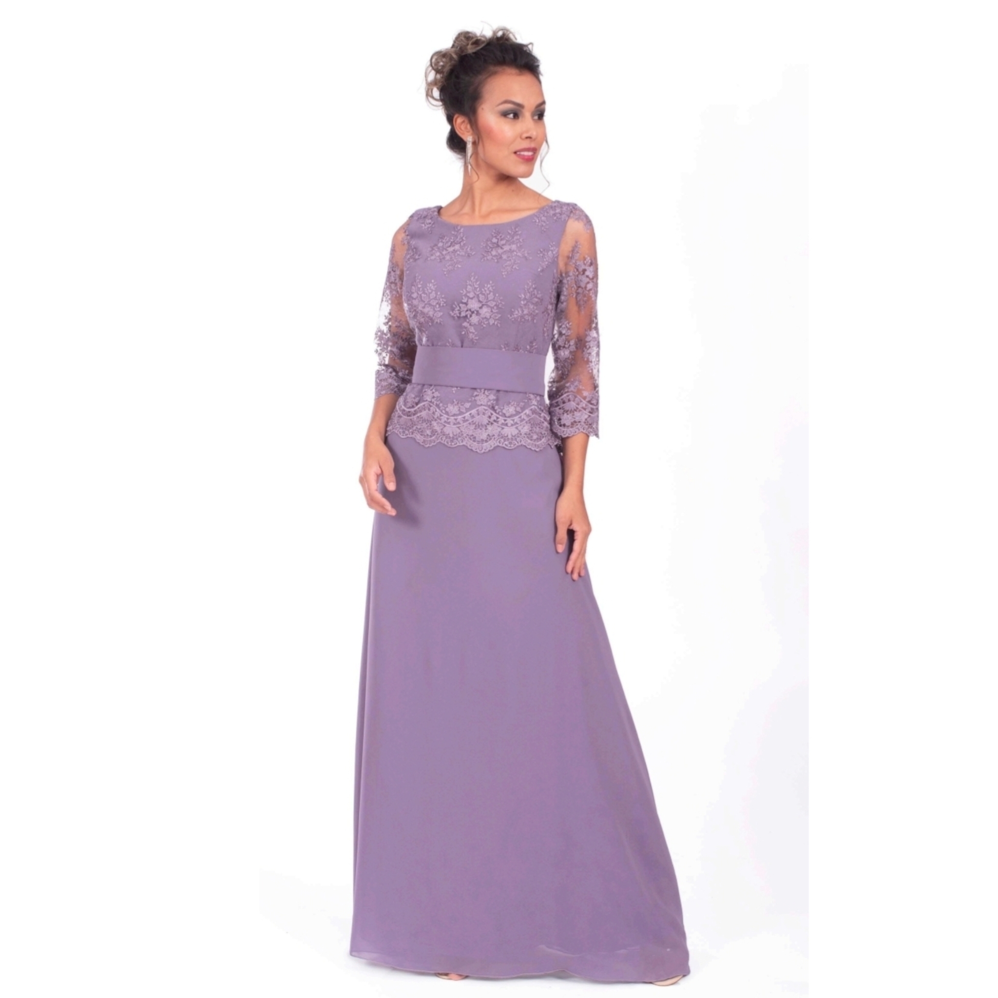 Vestido largo, con escote redondo, cierre trasero de cremallera invisible, mangas 3/4, en tul semitransparente bordada, parte de arriba hasta la cintura con flores bordadas, cinturón y parte de abajo lisa.