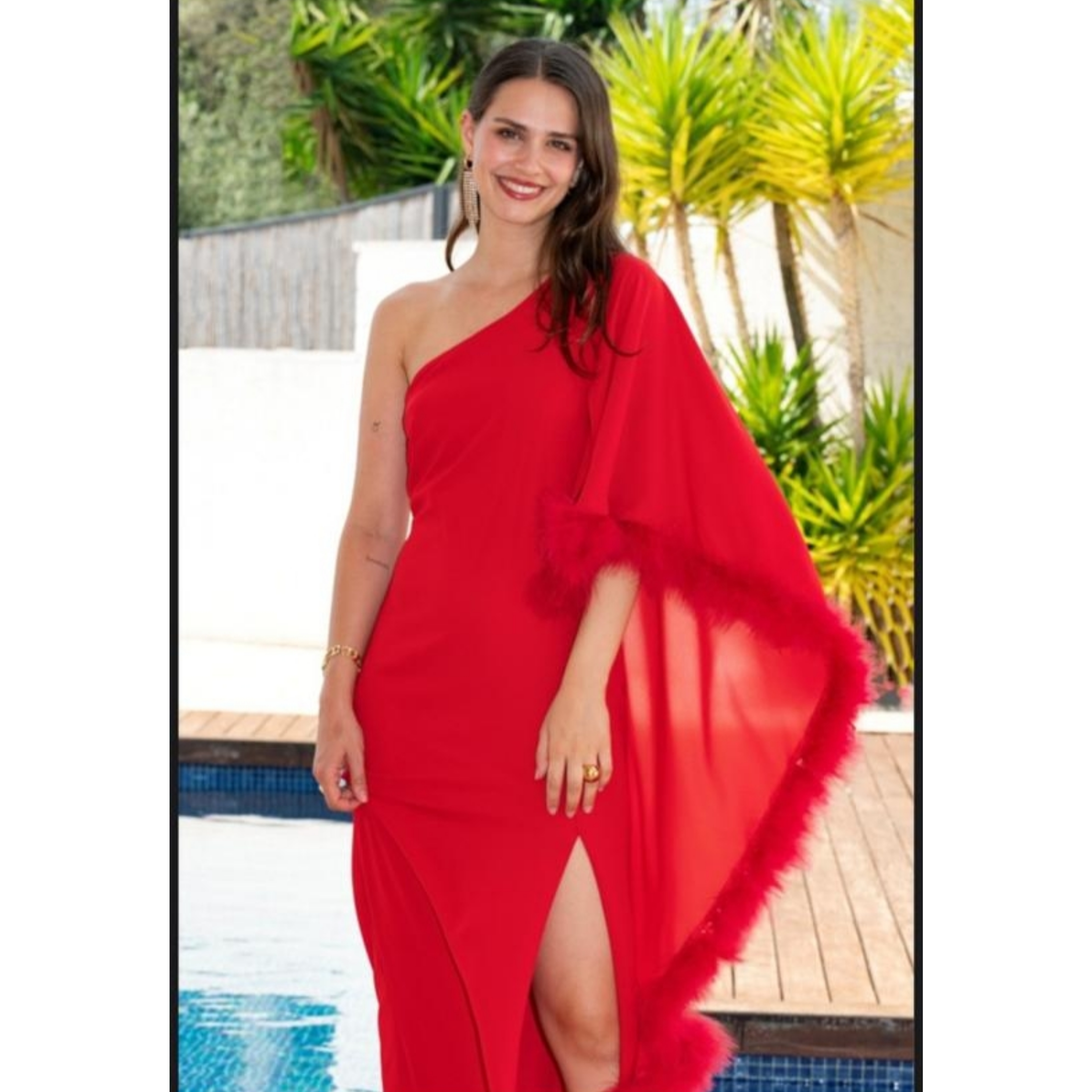 Vestido largo, de escote asimétrico, con pinzas en el pecho, una manga 3/4, abierta, formando una capa de plumas. Abertura lateral en el bajo, hasta el muslo. Disponible desde la 38, hasta la 44, en rojo.