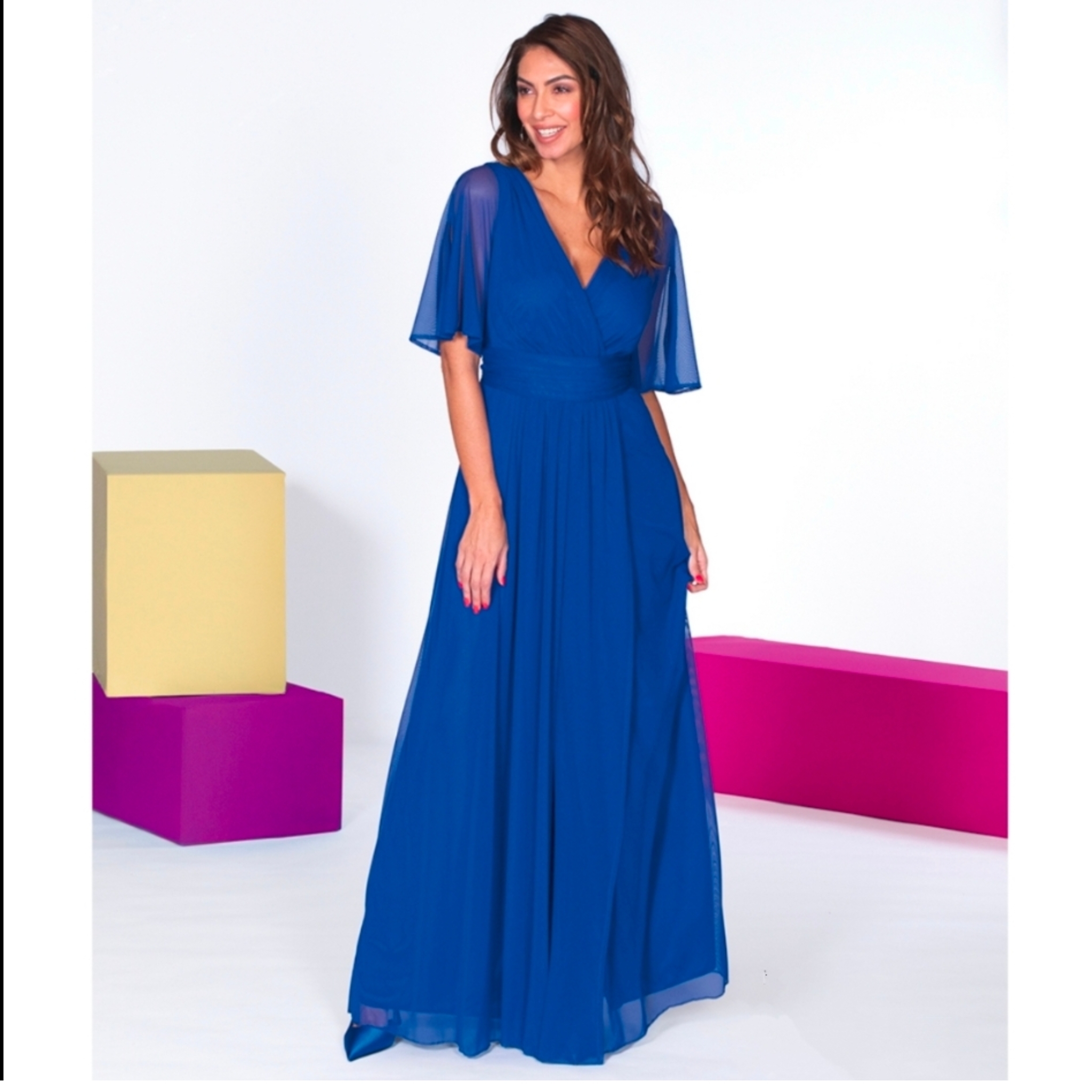 Vestido largo, con manga corta de gasa, abierta, escote de pico cruzado, cremallera lateral invisible, abertura en la falda. Incluye lazada. Se hace desde la talla 38 hasta la 54, en fucsia y en azul.