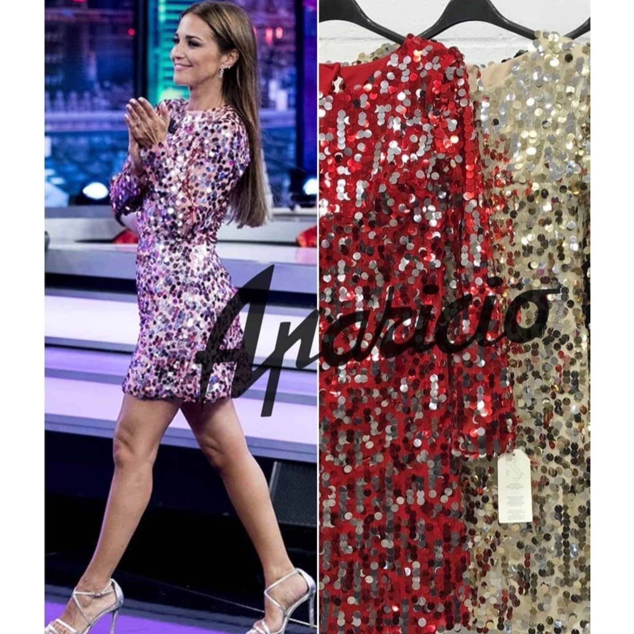 Vestido de lentejuelas grandes, con mangas largas, cierre trasero de un botón en el cuello, con pequeña abertura. Incluye cascos interior. Se hace en plata, oro, y rojo, talla única.