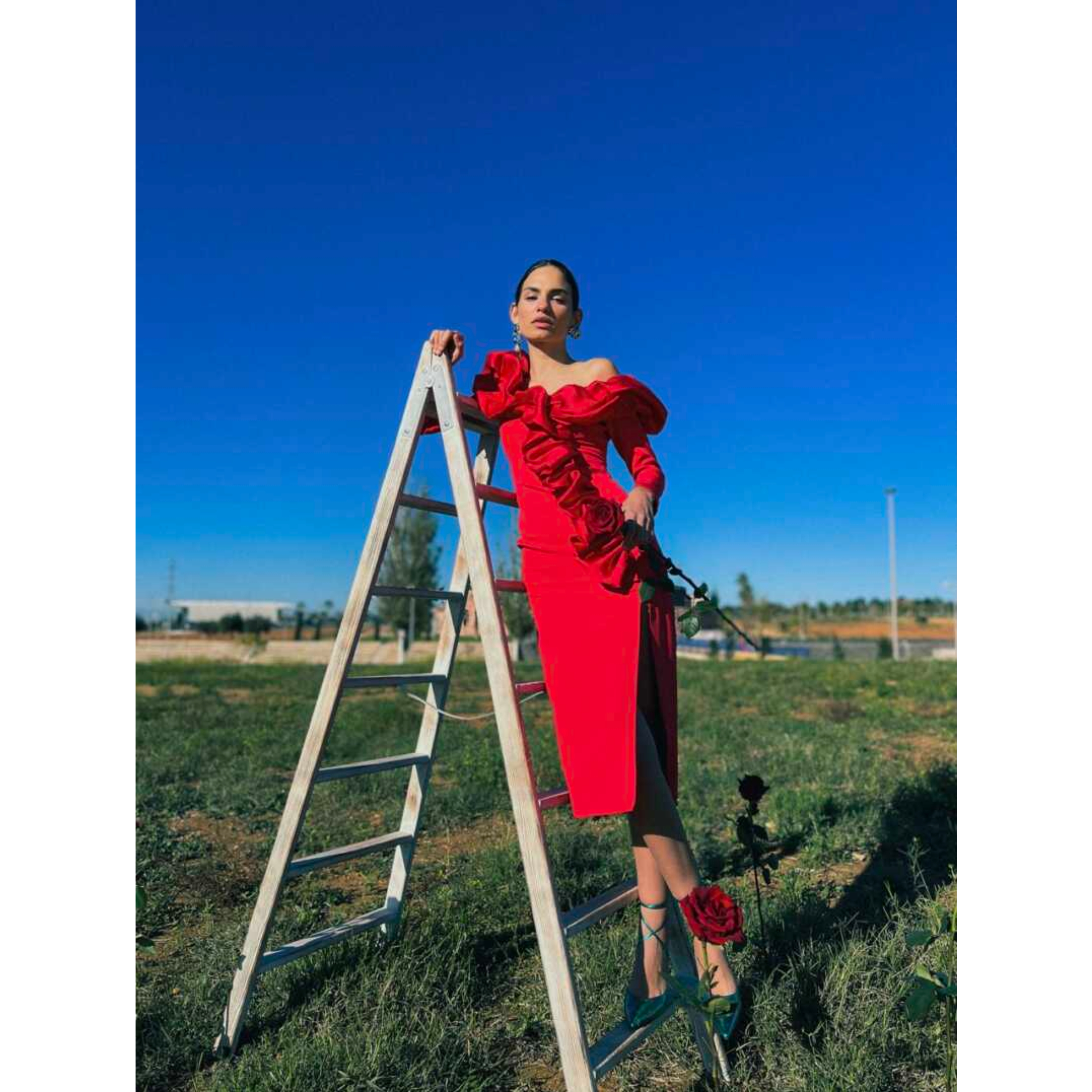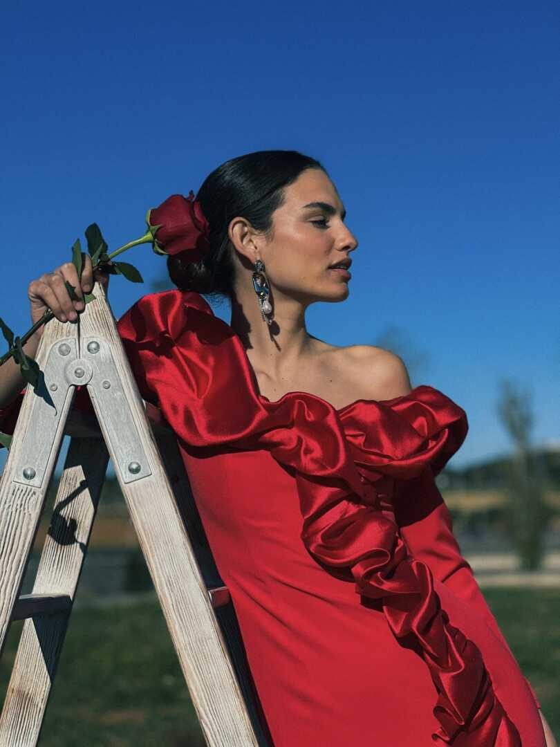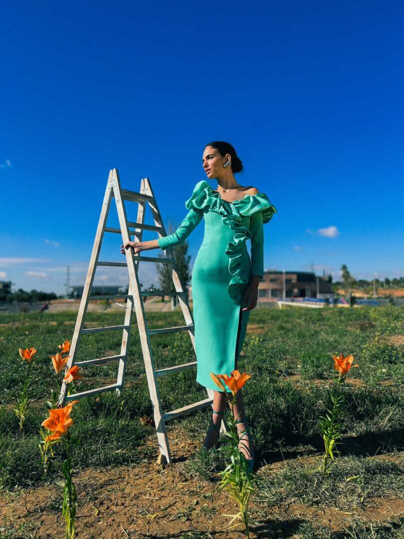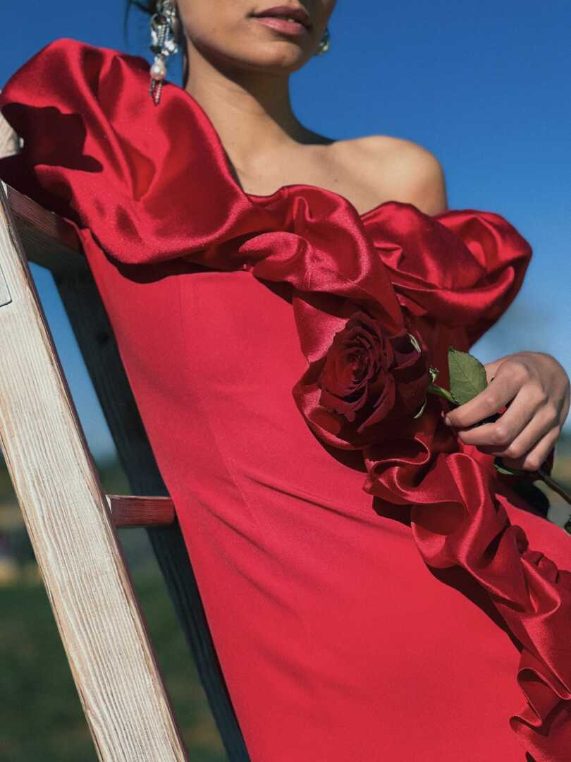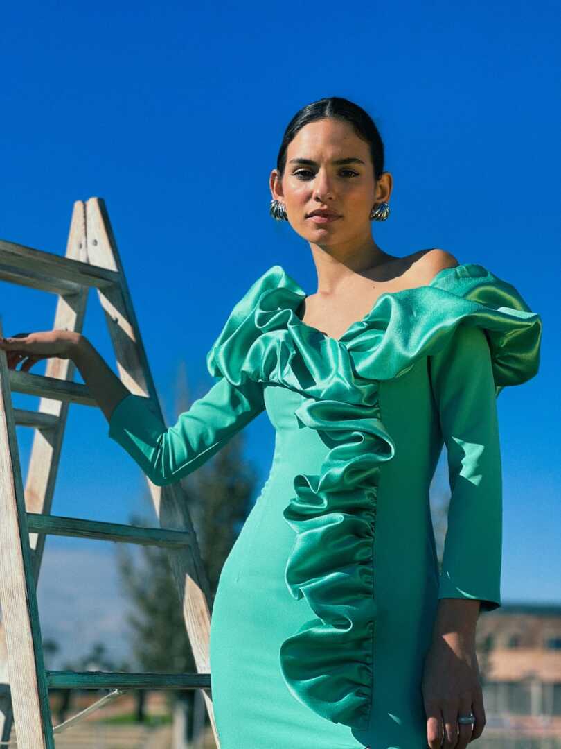 Vestido de corte midi, con mangas francesas, ajustado, con escote y volantes. Se hace desde la talla s hasta la XL. En rojo y en agua viva.