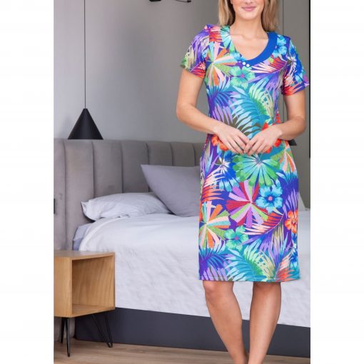 Vestido estampado de flores, de licra fría, con escote de pico, dos botones decorativos en el escote. Mangas cortas. Se hace desde la talla M hasta la XXL.
