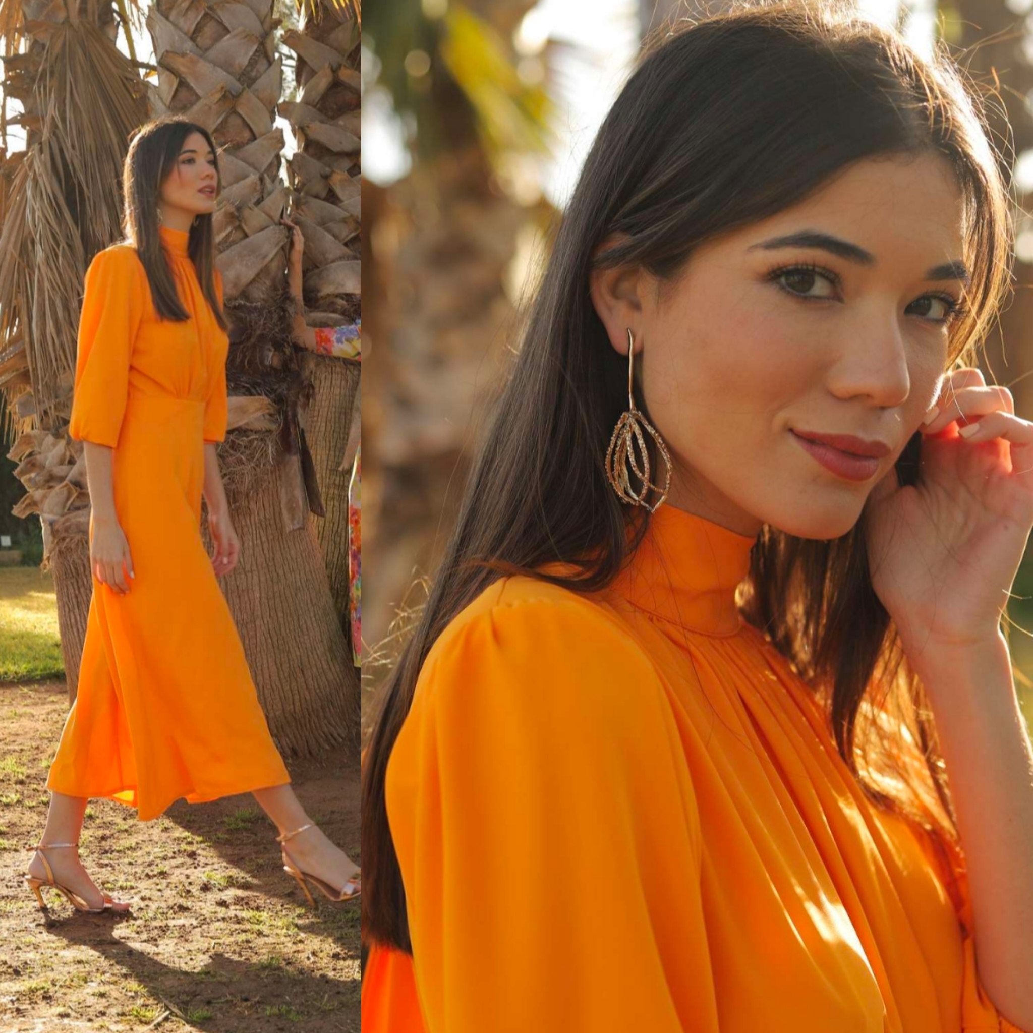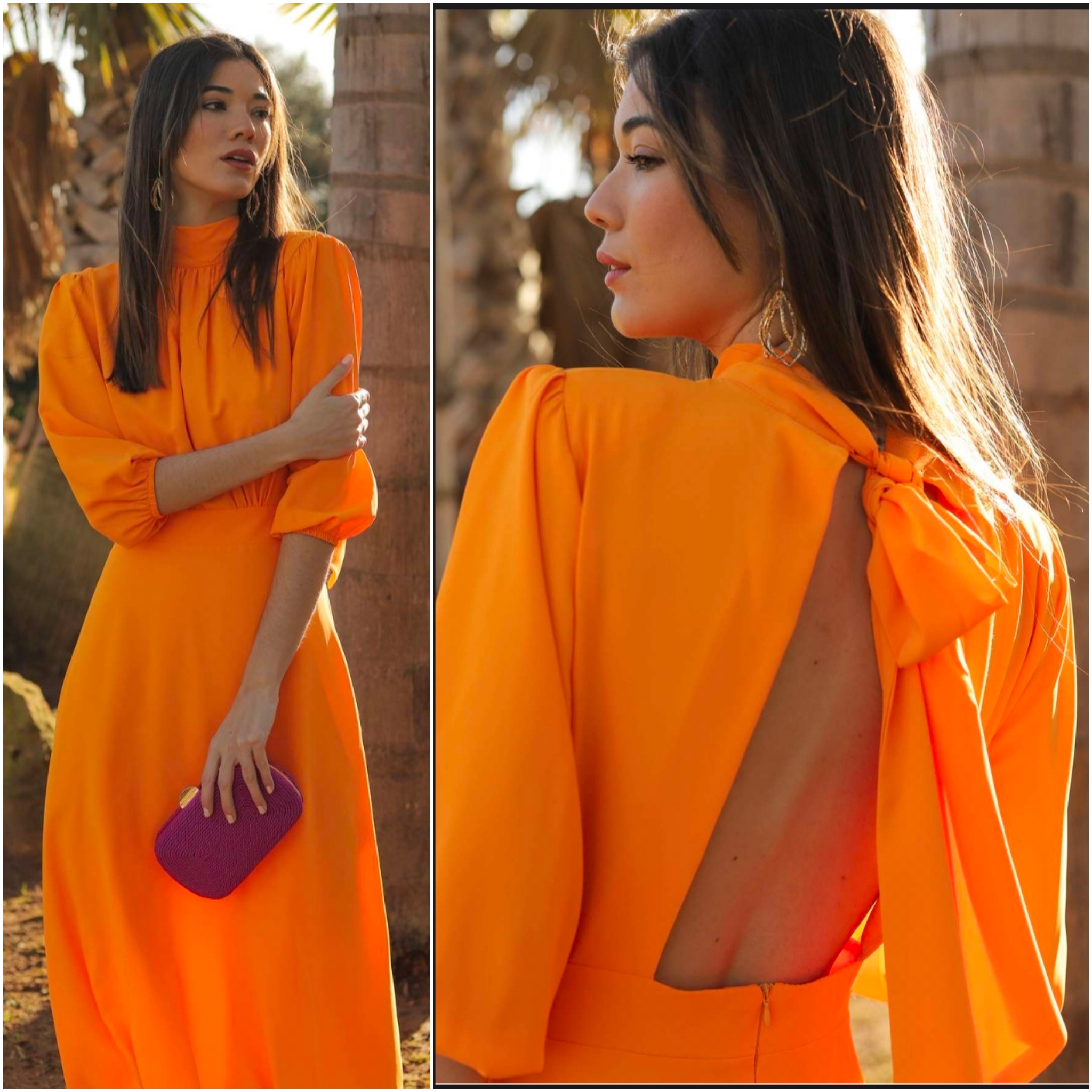 Vestido de largo midi, de mangas francesas con elástico, cerrado por delante, se ajusta al cuello con una lazada, y espalda abierta. Se hace desde la talla s hasta la xl.