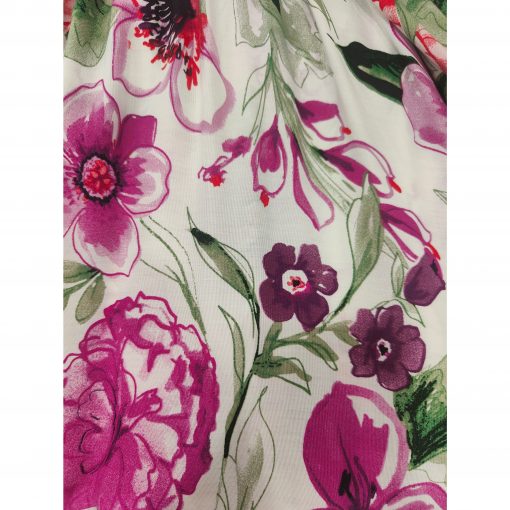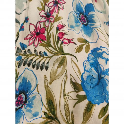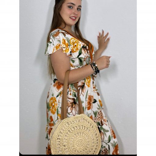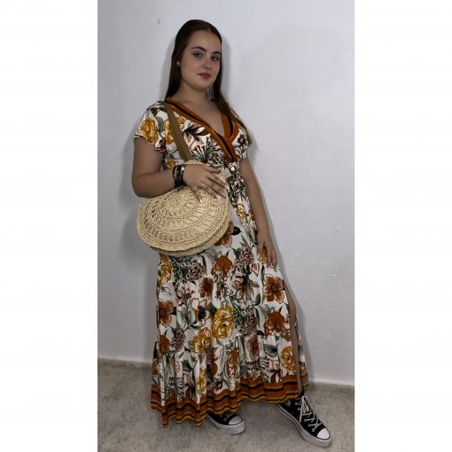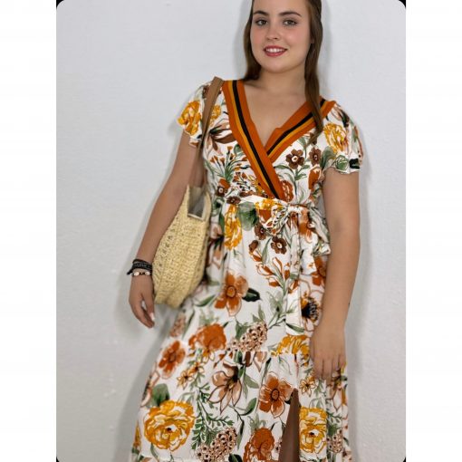 Vestido largo,  estampado de flores, de tejido fino y fresco, con escote de pico cruzado, goma elástica en la cintura, con lazada. Mangas cortas de volantes. Se hace desde la talla M hasta la XXL. En estampado mostaza, rosa y azul.