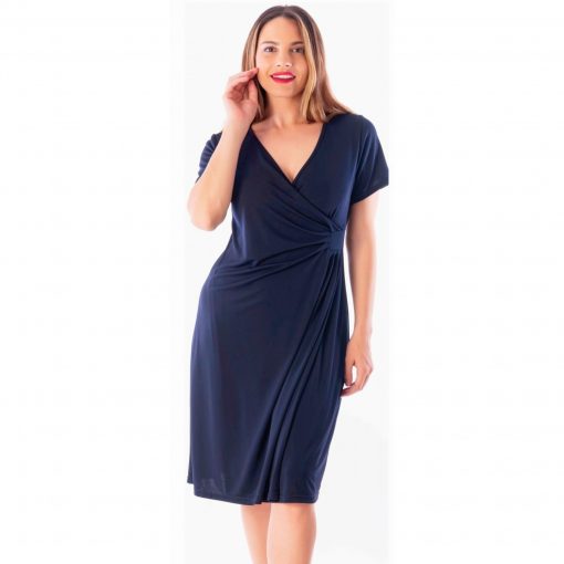 Vestido de punto de licra, con mangas cortas, escote de pico cruzado, y frunce en la cintura. Se hace desde la talla m hasta la xxl, también en color fucsia.