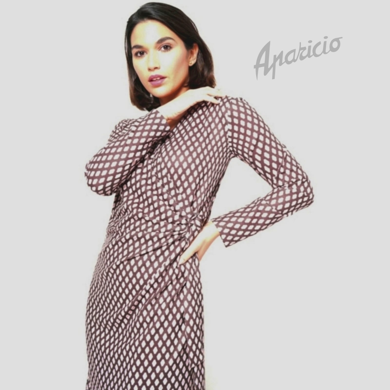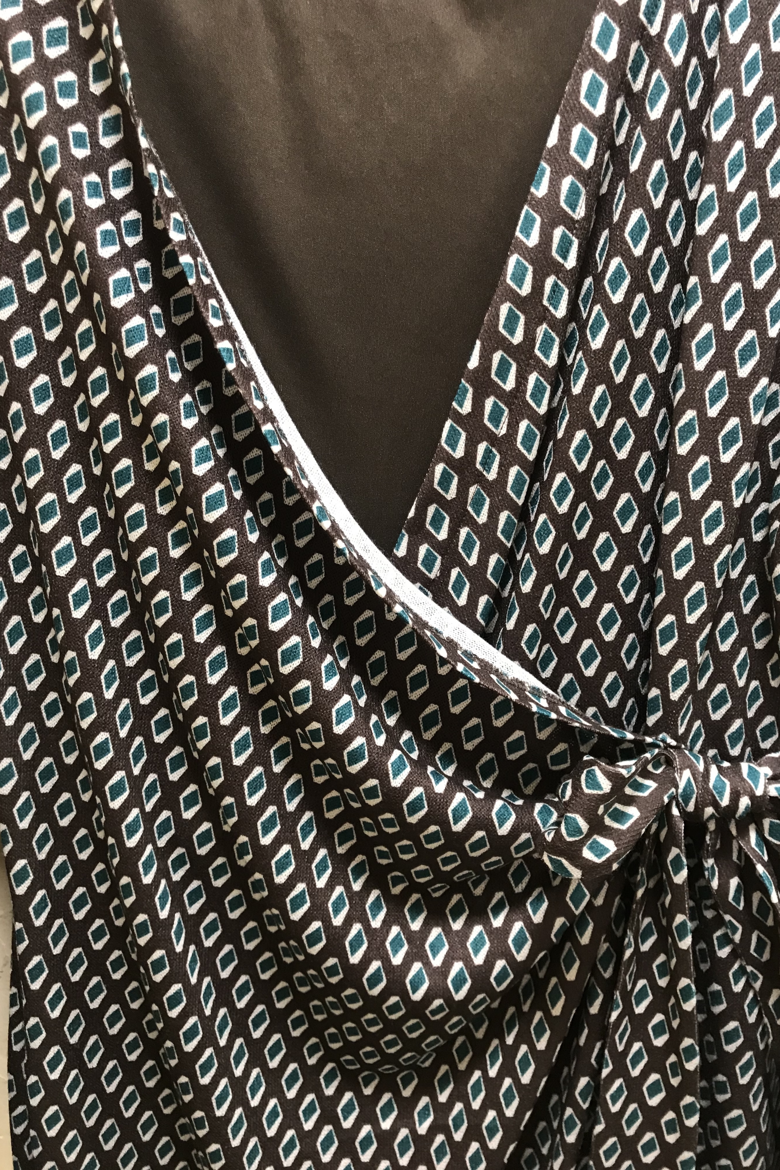Vestido marrón estampado con rombos verdes, de mangas largas, escote de pico cruzado, y adorno de lazo en lateral.