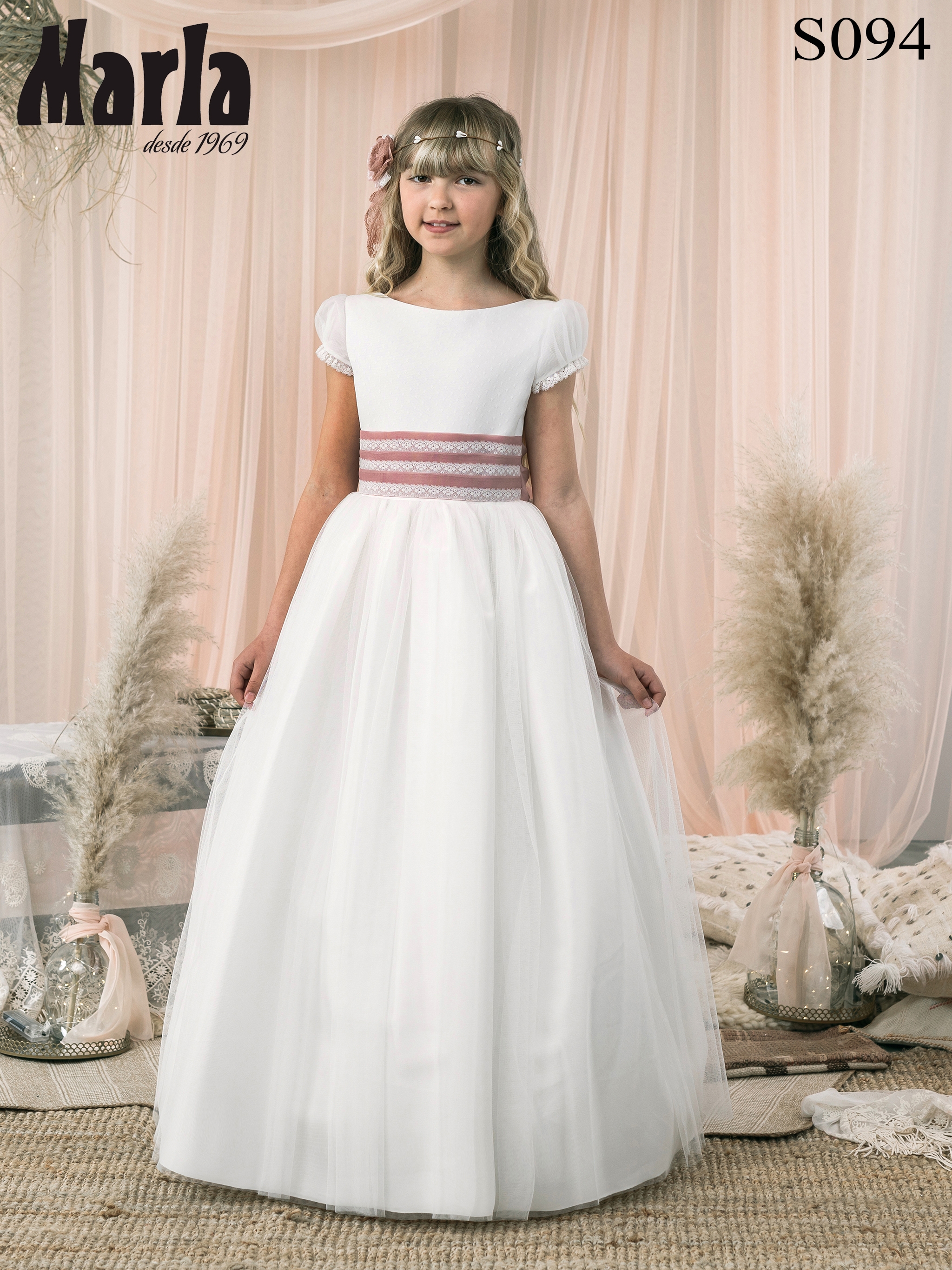 Vestido de comunión Con cuello barco, de mangas cortas, con adorno de color en la cintura. Medidas hasta 140 cm.