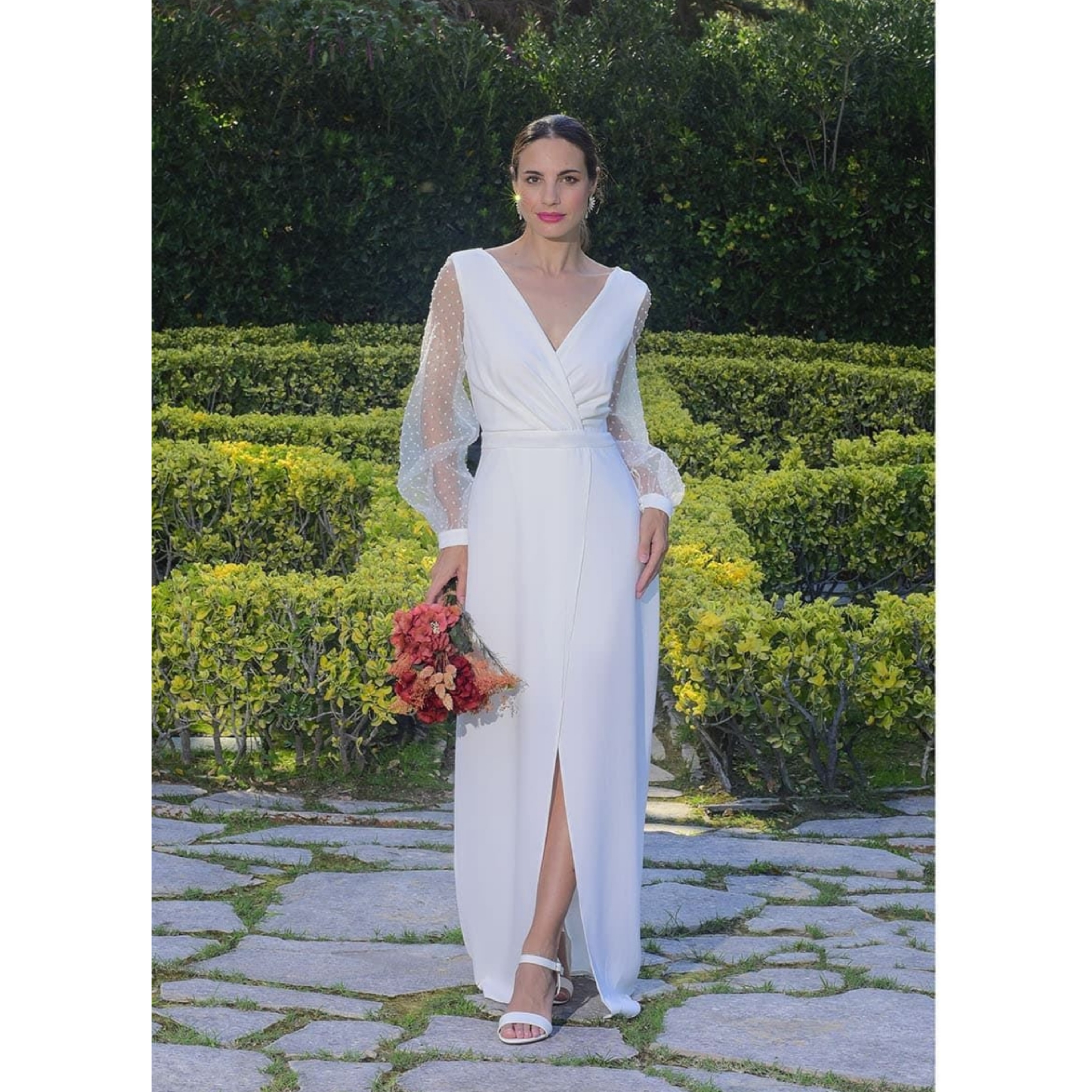 Vestido largo blanco, con escote de pico cruzado, mangas de largo 3/4, de plumeti, y abertura en el bajo. Se hace desde la talla 38 hasta la 54.