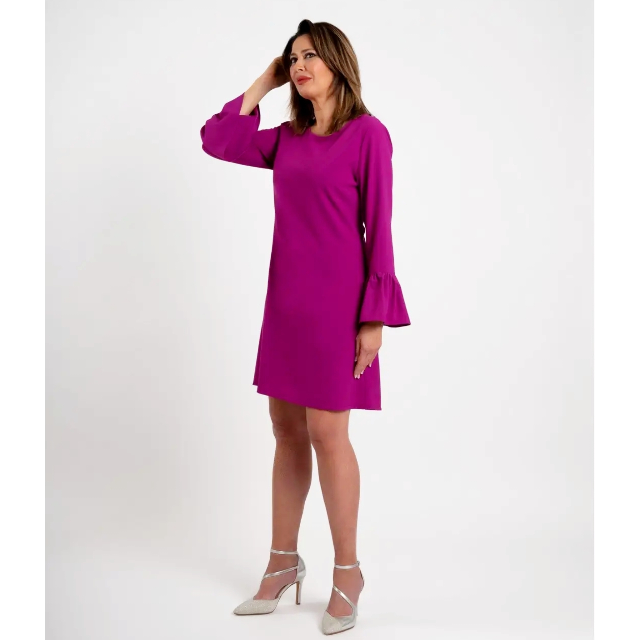 Vestido de mangas largas con volantes en los puños, escote redondo, suelto. Disponible desde la talla 50 hasta la 60, en buganvilla y en negro.