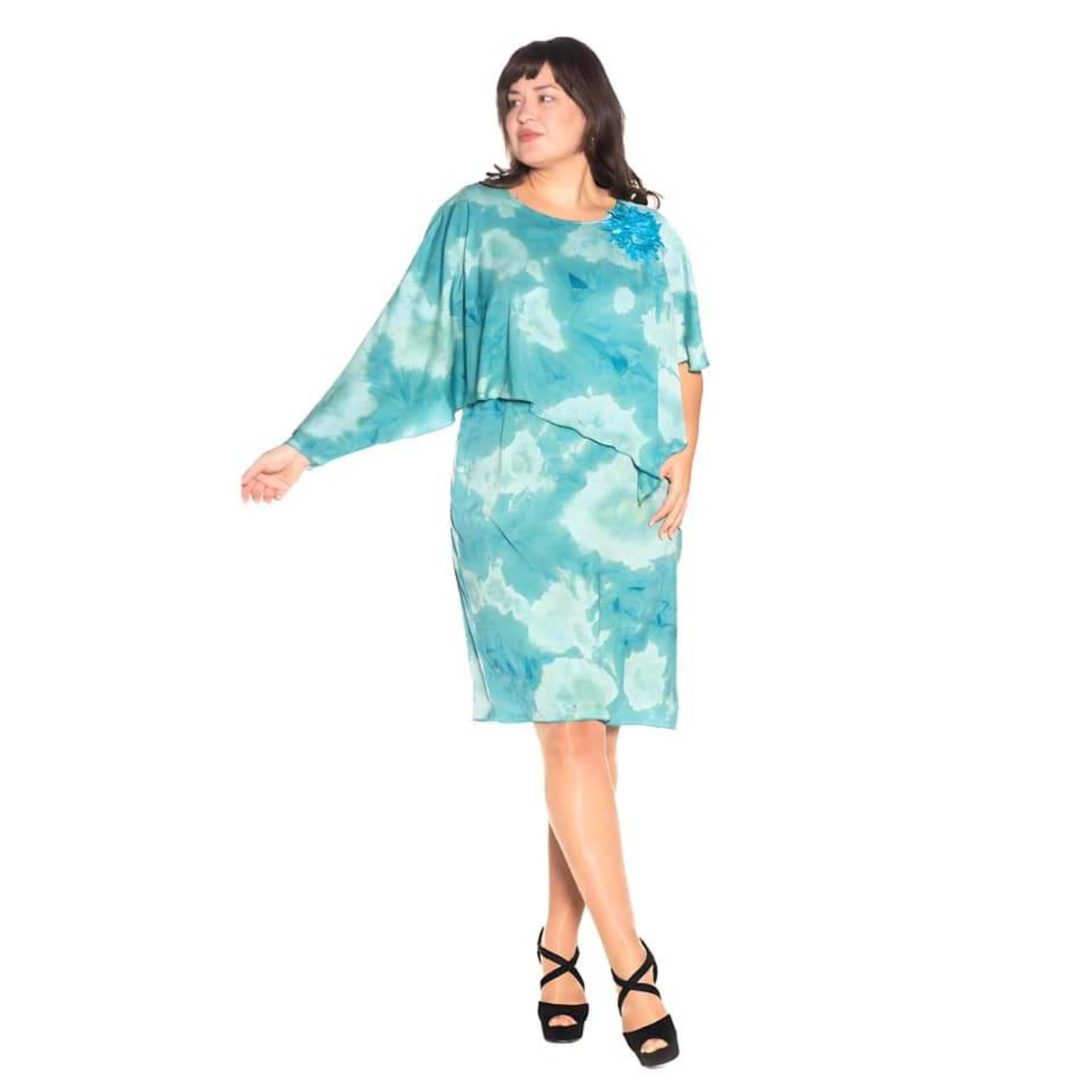 Vestido estampado, con cuello redondo, de tejido satinado. Asimétrico, con una manga corta de volante y una mas larga. Se hace para tallajes especiales, desde la M hasta la XXL. Que abarca desde la talla 44 hasta la 60, aproximadamente.