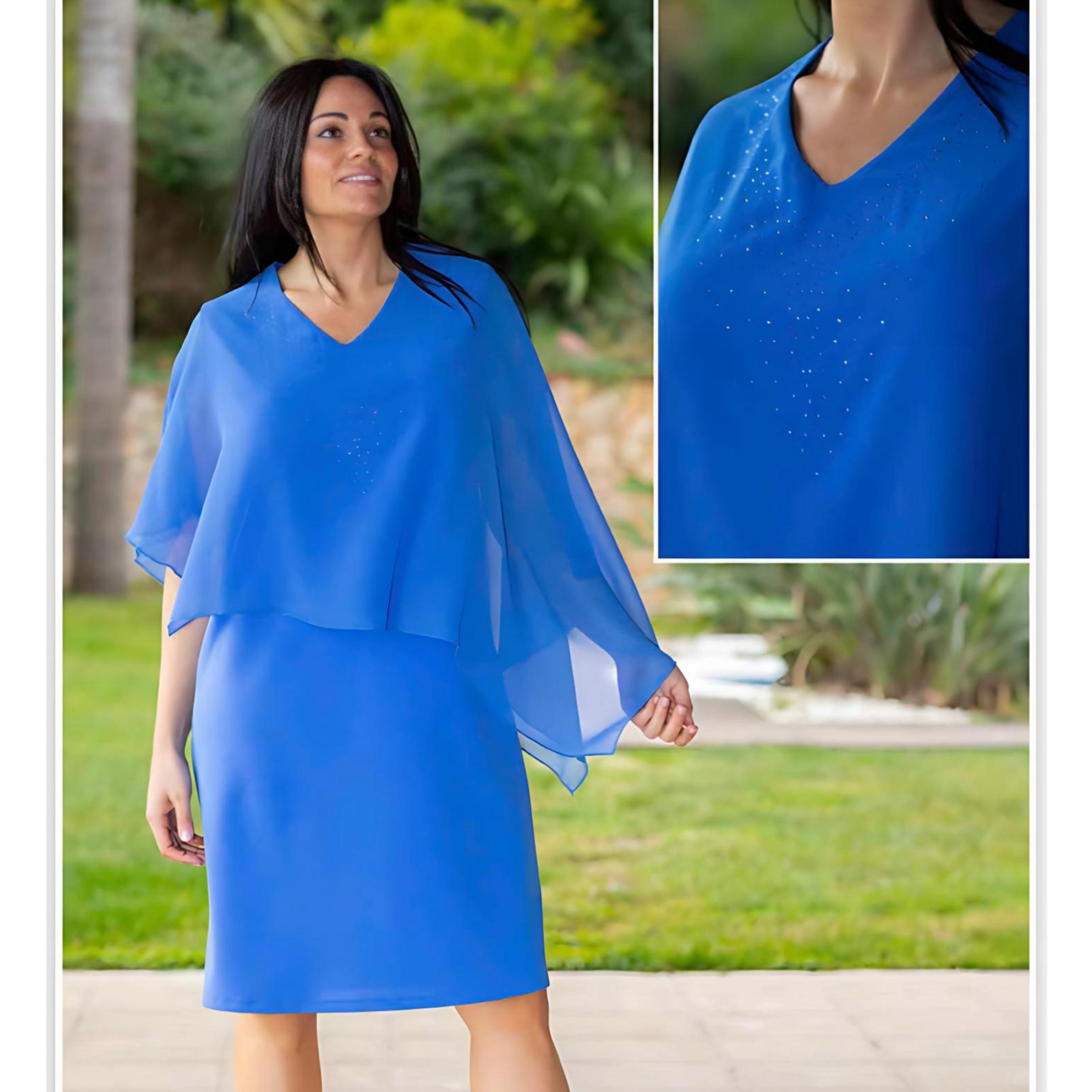 Vestido de cuello de pico, sin mangas, con sobre capa, unida. Brillantitos en el pecho. Se hace desde la talla S, hasta la XXXL.