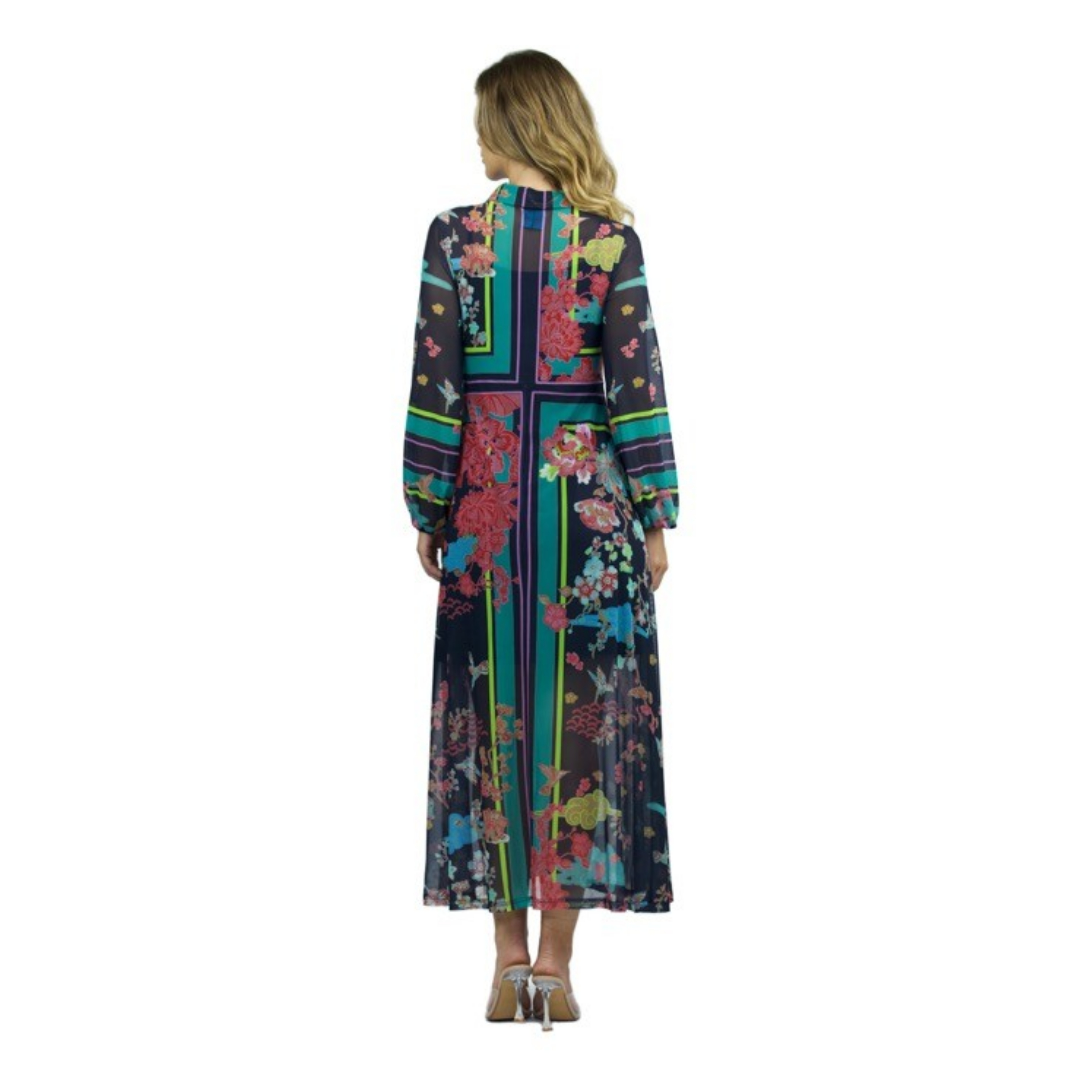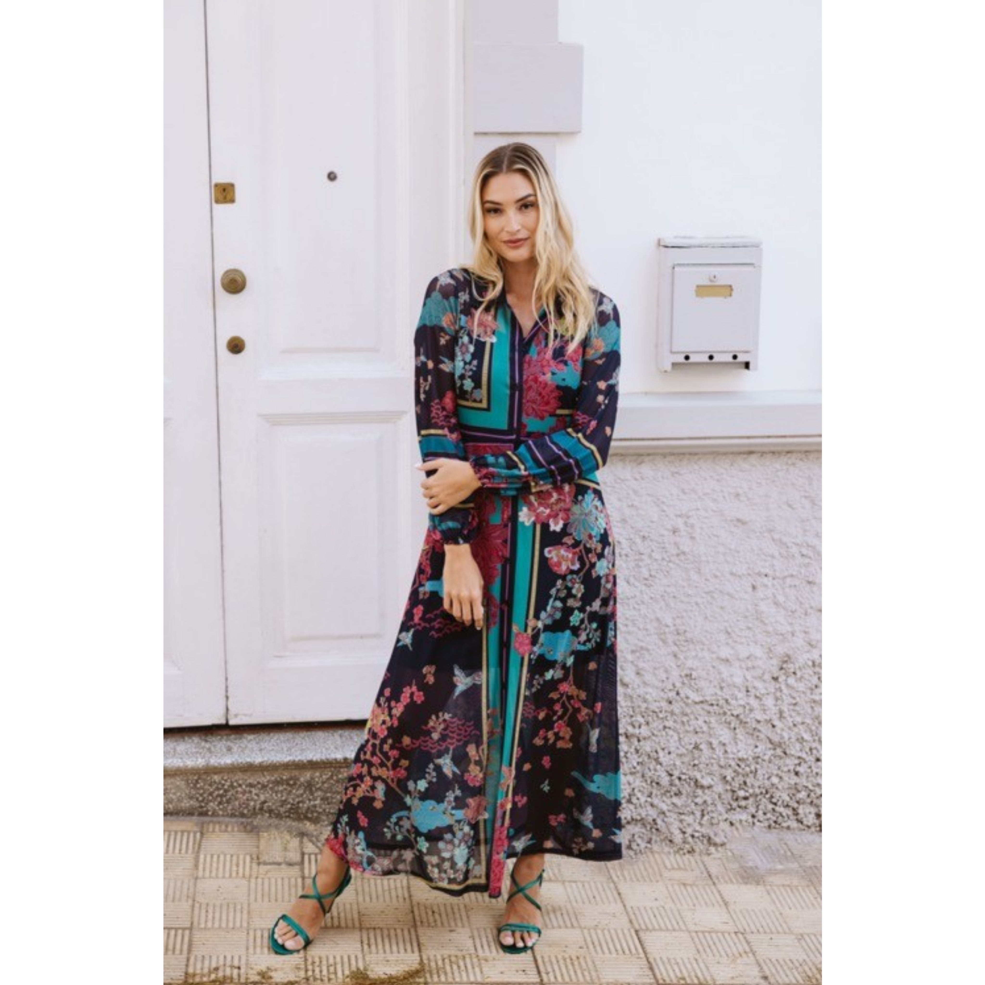Vestido largo, camisero, de tul de seda semitransparente, estampado con mangas largas, de gomillas, en los puños, cierre de botones y cuello de solapas. ( Forro interior largo de punto elástico, escote redondo y tirantes finos). Se hace desde la talla XS hasta la XXL.